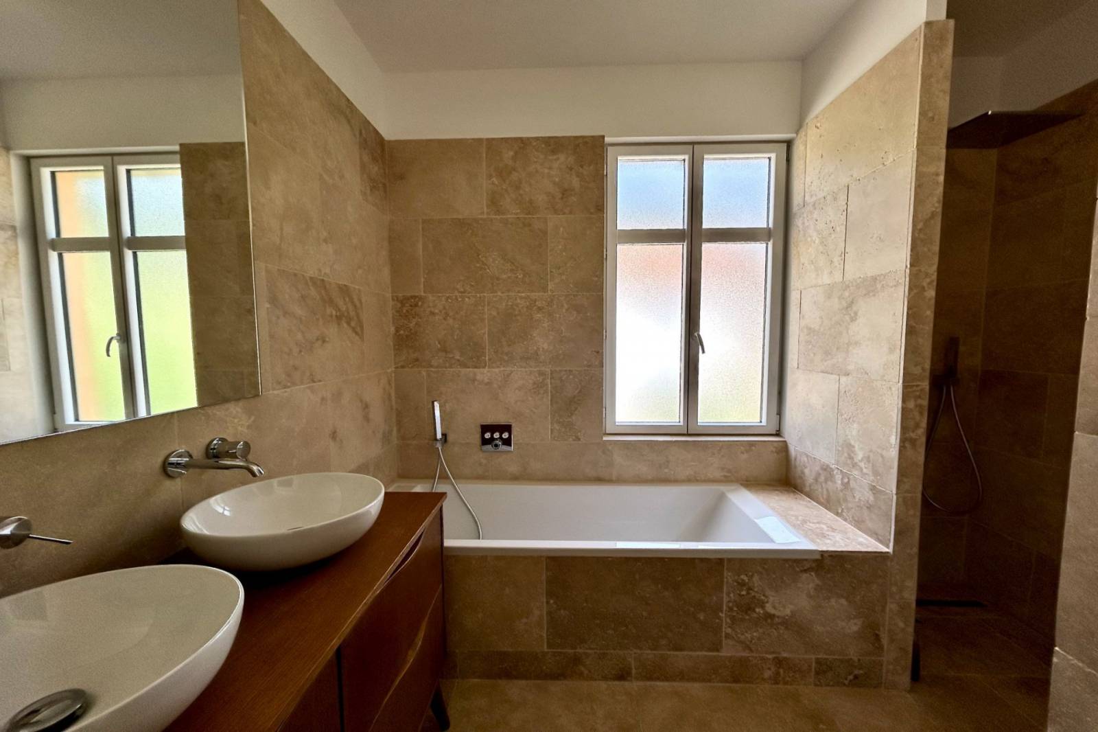 L’appartement comprend deux chambres confortables, chacune dotée de sa propre salle de douche. Ces espaces privés, élégamment rénovés, garantissent intimité et confort. Les matériaux choisis pour la rénovation sont de qualité, apportant une touche contemporaine tout en respectant le charme de l’ancien. La disposition des pièces optimise l’espace, offrant un cadre de vie agréable et fonctionnel.