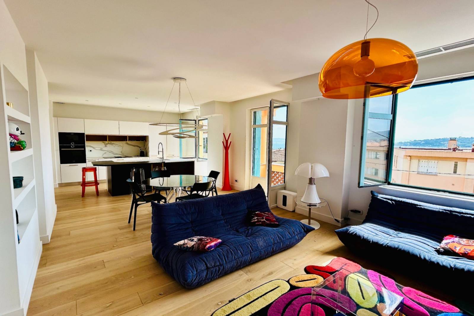 Dès l’entrée, on est séduit par un spacieux séjour baigné de lumière, grâce à de larges baies vitrées qui ouvrent sur un balcon orienté plein sud. Ce balcon invite à la détente, offrant un panorama imprenable sur la mer Méditerranée, idéal pour profiter des couchers de soleil ou partager des moments conviviaux en famille ou entre amis. La cuisine attenante est entièrement aménagée et équipée, pensée pour allier praticité et esthétisme. Elle s’intègre parfaitement à l’espace de vie, créant une ambiance chaleureuse et accueillante.
