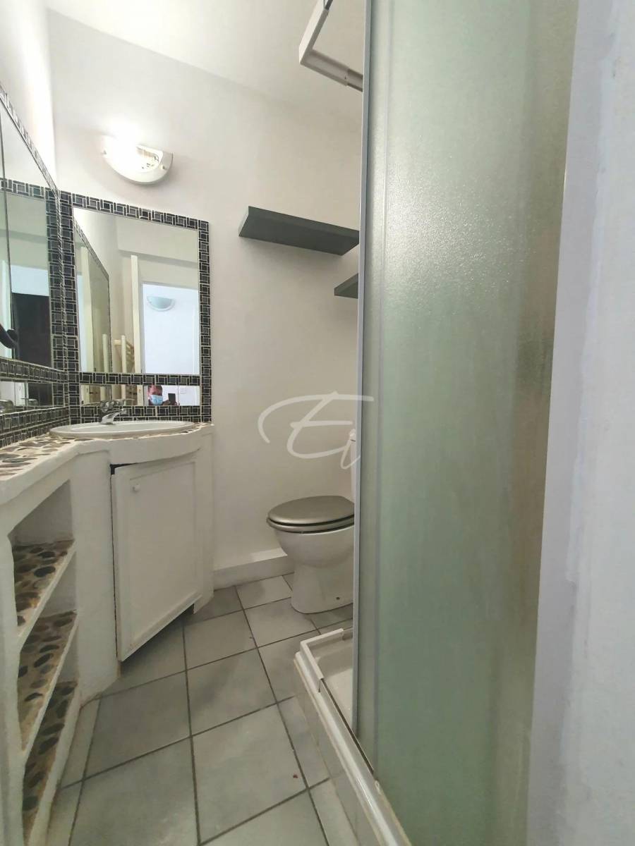 Ce studio à la vente en rez de jardin à ste maxime dans le var est un véritable havre de paix de par sa lumière et son calme, les volumes offrent confort et la configuration permet un agencement optimisé de par les pans de murs libres.
