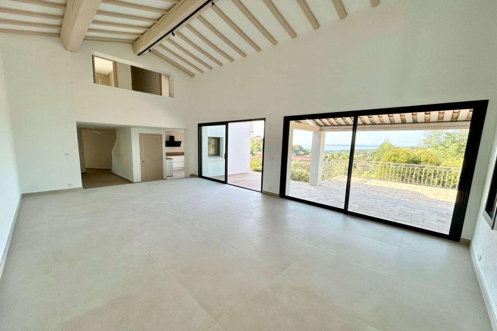 Cette jolie villa, récemment rénovée, est à vendre sur les hauteurs des Issambres, offrant une vue imprenable sur la mer. Elle se distingue par son architecture moderne et ses finitions de qualité, créant un cadre de vie agréable et confortable. En entrant dans la villa, vous serez accueilli par un hall d'entrée spacieux qui mène à un séjour cathédrale, baigné de lumière naturelle grâce à de grandes fenêtres. Ce séjour est l'endroit idéal pour se détendre en famille ou recevoir des amis, avec un espace généreux qui favorise les moments de convivialité.