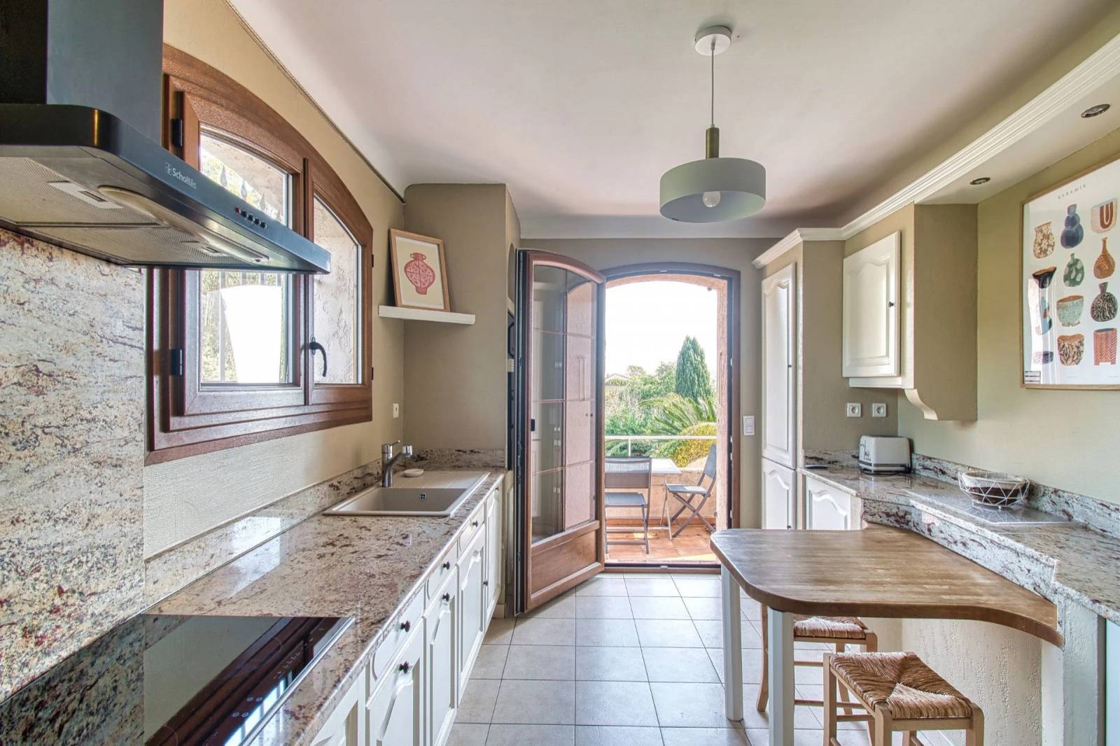 La villa dispose d'un hall d'entrée accueillant qui dessert un lumineux séjour avec cheminée, une salle à manger séparée et une cuisine indépendante aménagée. Ces pièces de vie généreuses favorisent les moments de partage en famille ou entre amis, tandis que la cheminée apporte une atmosphère chaleureuse lors des soirées plus fraîches. Les espaces sont baignés de lumière et s'ouvrent sur les extérieurs, offrant une continuité entre intérieur et extérieur.